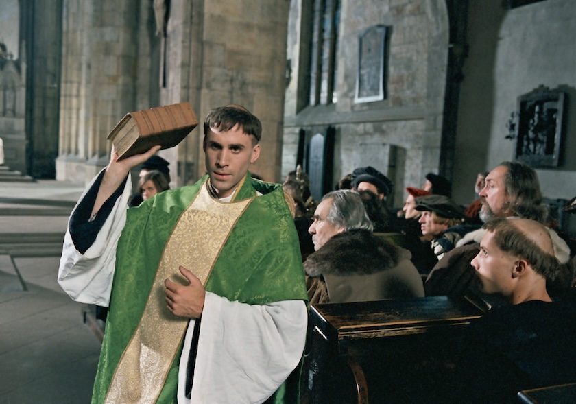 La película arranca con la ya mítica tormenta por la que Lutero decide hacerse monje en Erfurt en 1505, a pesar de la oposición de su padre. Es allí donde conoce al vicario general de los agustinos en Alemania, Staupitz, magistralmente interpretado por el actor suizo Bruno Ganz, que tantas grandes películas hizo en el nuevo cine alemán con directores como Wim Wenders. Su habitual papel contenido adquiere aquí un singular dramatismo en este interesante personaje, que ha venido a ser prototipo del catolicismo-romano más filo-protestante, siempre tan cerca, pero a la vez tan lejos de la Reforma. Para él, como para tantos católicos hoy, el problema del protestantismo es que no ve lo positivo que todavía hay en la Iglesia de Roma, aunque le recomienda a Lutero leer la Biblia cada día, mandándole a Wittenberg para estudiar.