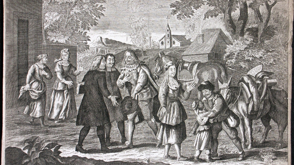 El cura y el bachiller reciben a Don Quijote y a Sancho al llegar a la ladea. / Foto: [link]Biblioteca virtual Miguel de Cervantes[/link].