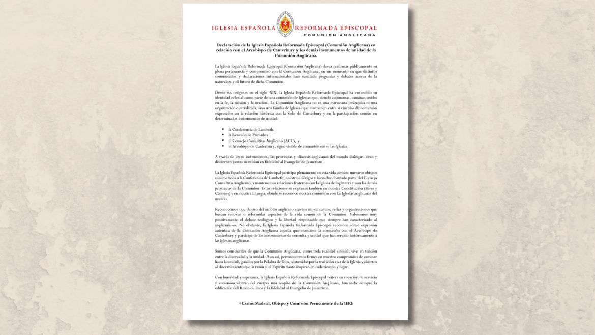 La declaración concluye: “Con humildad y esperanza, la Iglesia Española Reformada Episcopal reitera su vocación de servicio y comunión dentro del cuerpo más amplio de la Comunión Anglicana, buscando siempre la edificación del Reino de Dios y la fidelidad al Evangelio de Jesucristo”.